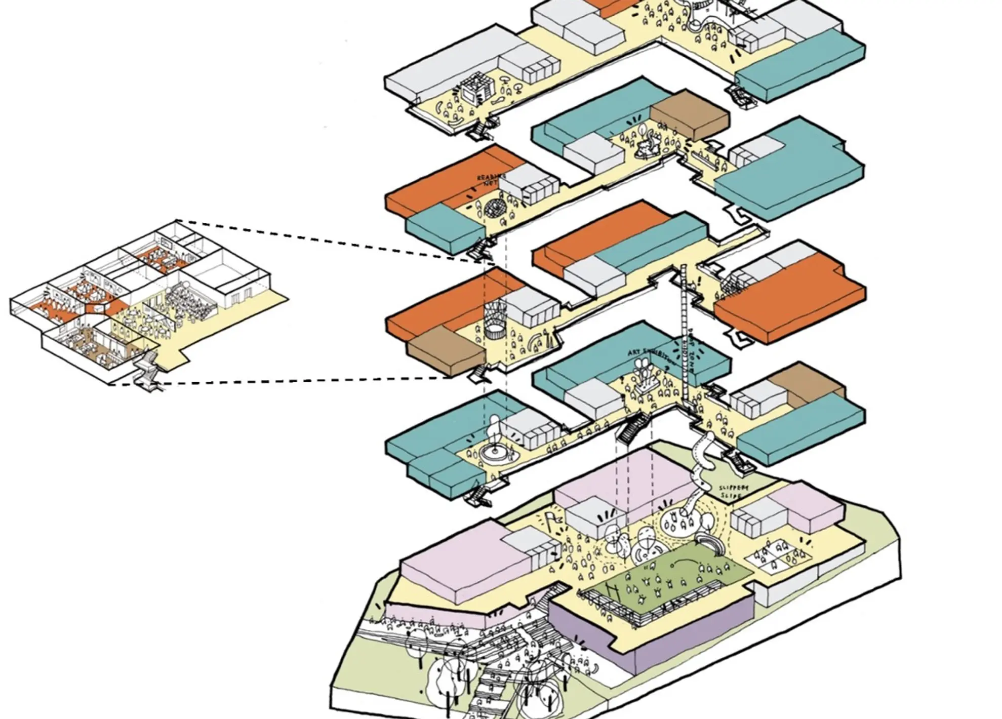 Students navigate the buildings 'vertical city streets' through galleries and up and down stairs.