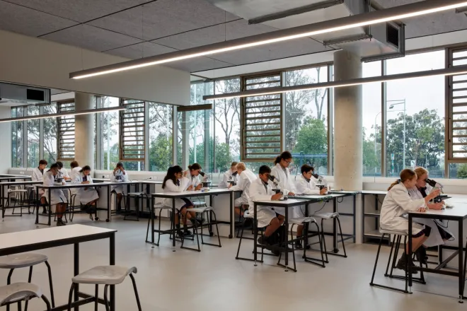 Sustainability permeates the design and educational philosophy of the school. Solar power, water harvesting, natural ventilation and low energy systems reduce impact. Active transport facilities and connections to public transport provide the platform for an educational focus on a “sustainable world” through recycling facilities and systems throughout the school.
