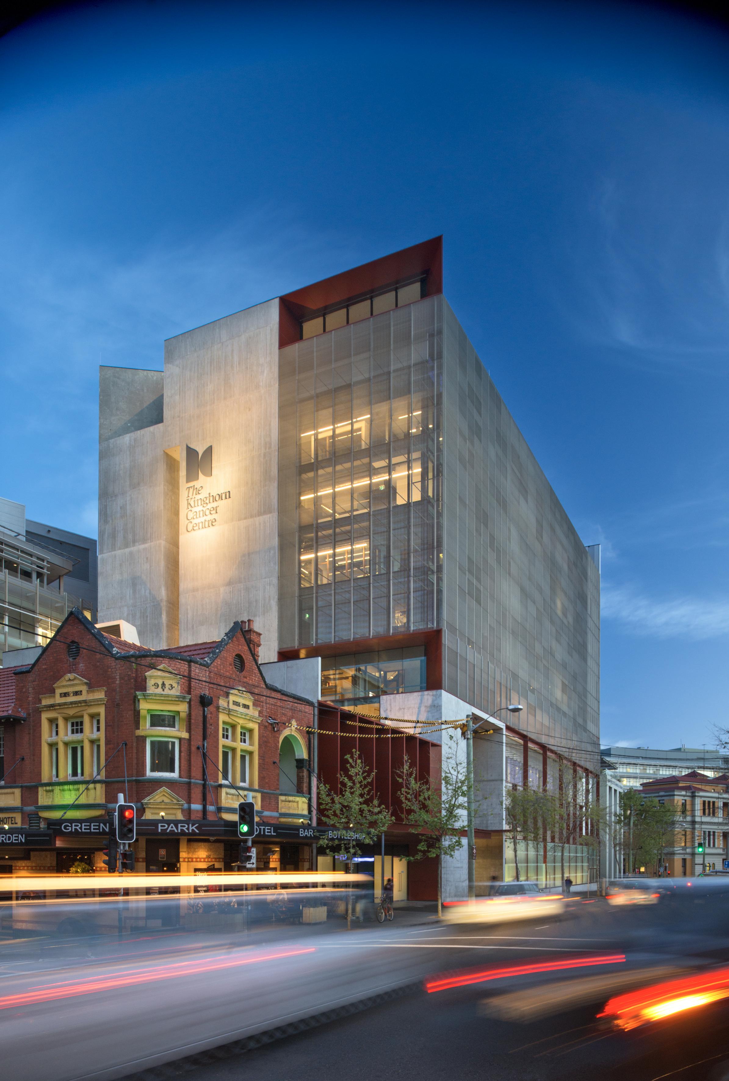 Kinghorn Cancer Centre, rises out of the skyline. It’s a compelling silhouette: a silver screen that glows by night.