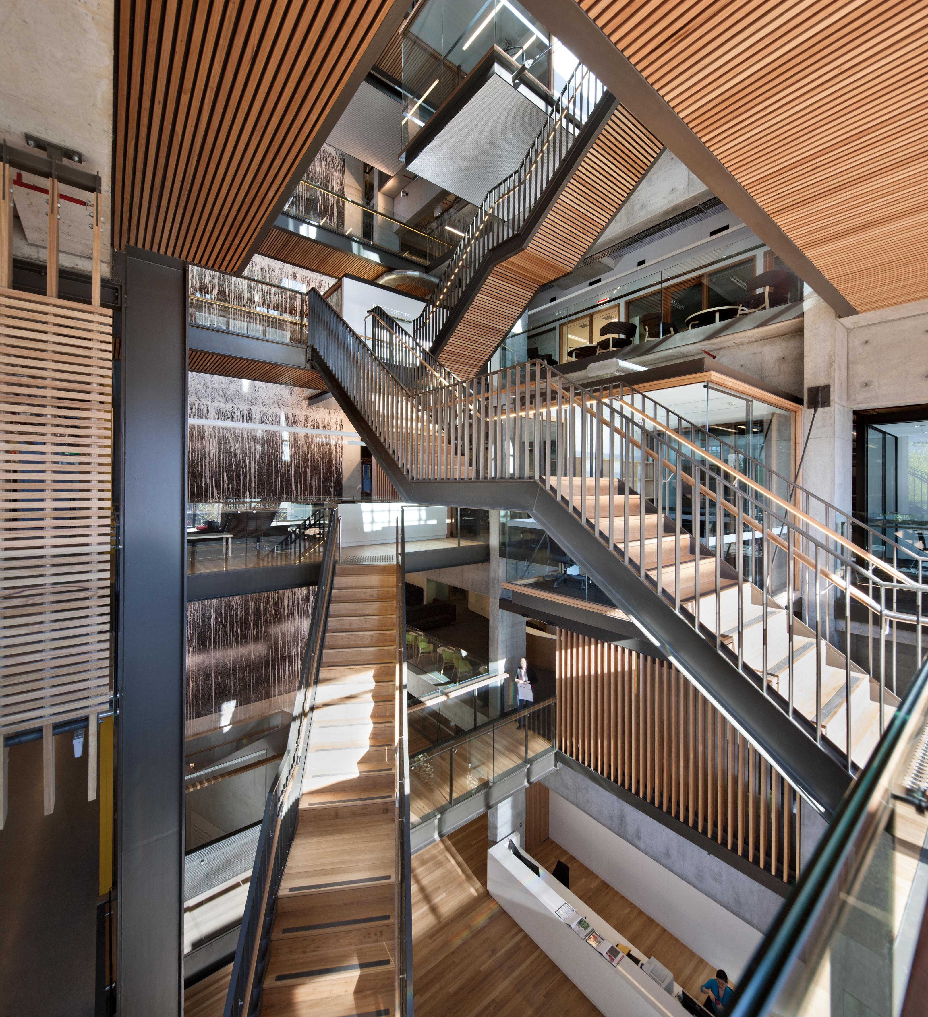 The atrium inside feels warm, active and healing. Criss-crossed by bridges and stairs, it’s a dynamic space that brings the flow of people at work into public view. Whether that’s on their way to get a coffee or crossing the atrium bridge to a lab, the design encourages chance meetings, casual conversations and “oh I’m glad I caught you” moments.