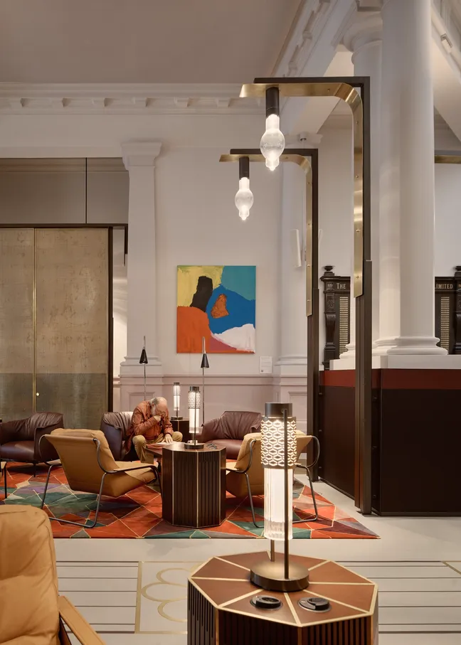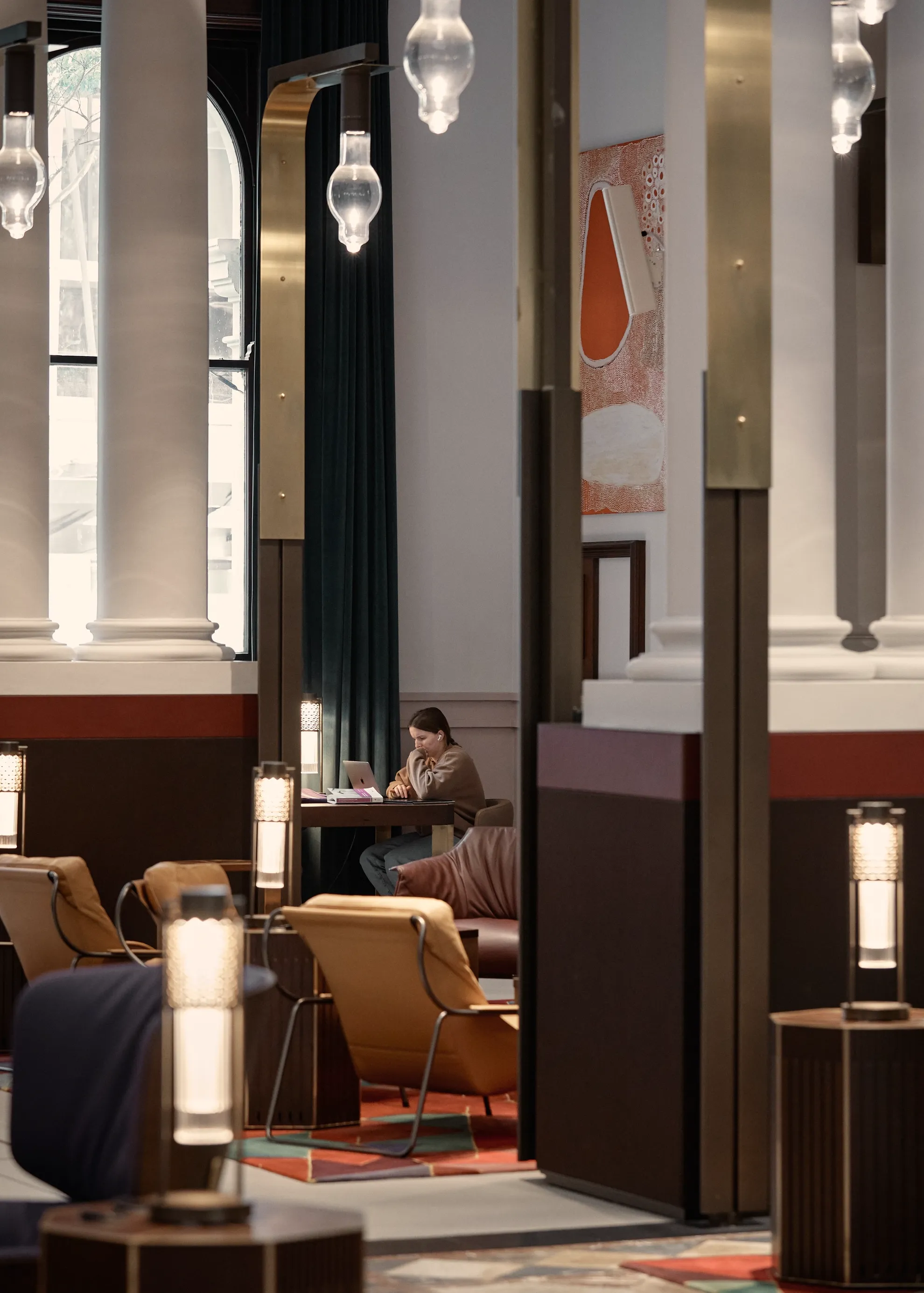 Bespoke floor lamps match the gravitas of heroic spaces, while smaller table lamps bring warmth and intimacy to human-scaled nooks.