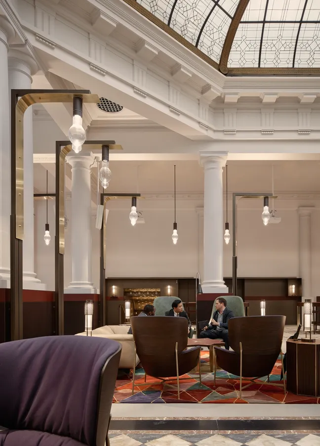 A respectful approach of minimal interference saw an underfloor services network and on-floor installations introduced to deliver power, data, conditioned air and AV. Floor inlays, timber joinery and custom carpets were informed by the dome's geometry and Maltese cross motifs with dazzling shades of crimson and violet echoing the coloured glass of the dome before 1920.