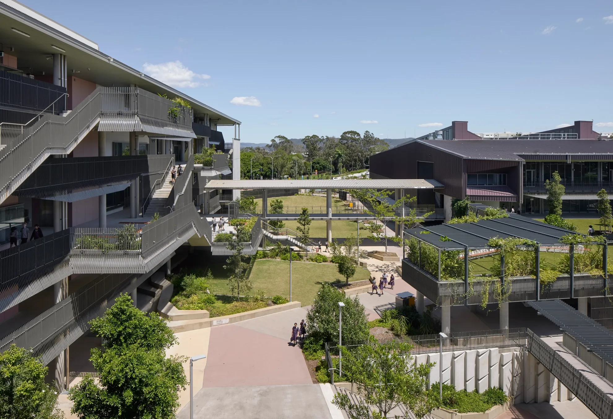 Inside the atrium, winding staircases of orange steel guide an ascending ‘track’ through the heart of the building. Staircase landings orient views to culturally significant sites, nominated by the six clans of the Gumbaynggirr People.